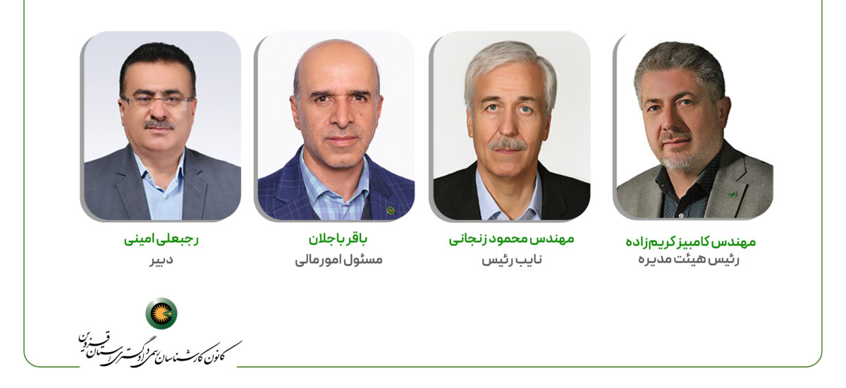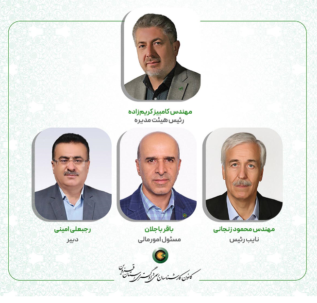 مهندس کامبیز کریمزاده به عنوان رئیس کانون، مهندس محمود زنجانی به عنوان نایبرئیس، آقای باقر باجلان به عنوان مسئول امور مالی و آقای رجبعلی امینی به عنوان دبیر کانون کارشناسان رسمی دادگستری استان قزوین انتخاب گردیدند.